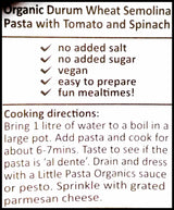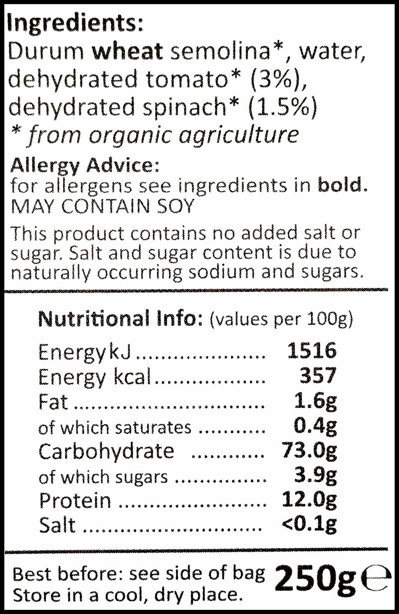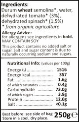 Organic durum wheat semolina, water, organic dehydrated tomato 3%, organic dehydrated spinach 1,5%.