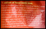 - Love Crunch products are made with passion and purpose to help the world eat, act, and live out of love. When you purchase a product, we donate the equivalent in cash and organic food to food banks, through our Bite4Bite program.
