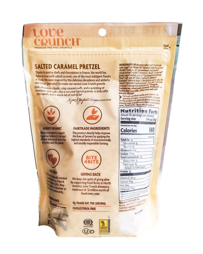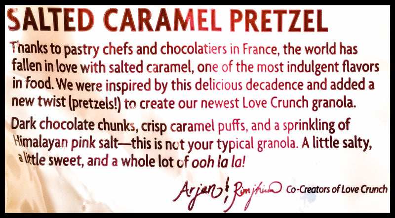 - Get a little sweet, a little salty, and a whole lot of ‘oooh la la!’ with Love Crunch Salted Caramel Pretzel granola. A pairing of salted caramel and pretzels, with dark chocolate chunks, crisp caramel puffs and a sprinkling of Himalayan pink salt round out a truly unforgettable experience.