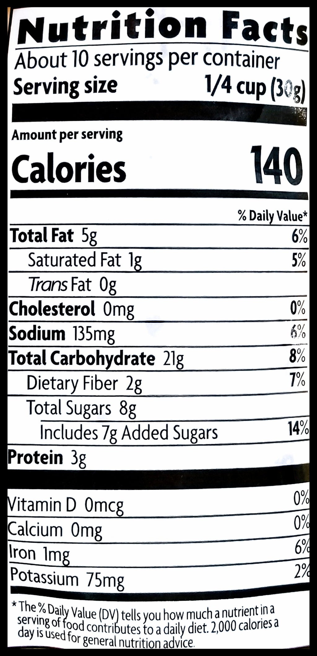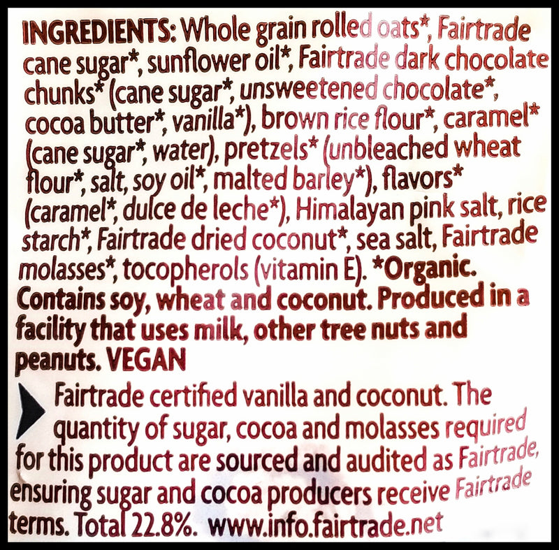 Whole grain rolled oats*, Fairtrade cane sugar*, sunflower oil*, Fairtrade dark chocolate chunks* (cane sugar*, unsweetened chocolate*, cocoa butter*, vanilla*), brown rice flour*, caramel* (cane sugar*, water), pretzels* (unbleached wheat flour*, salt, soy oil*, malted barley*), flavors* (caramel*, dulce de leche*), Himalayan pink salt, rice starch*, Fairtrade dried coconut*, sea salt, Fairtrade molasses*, tocopherols (added to enhance freshness). *Organic.