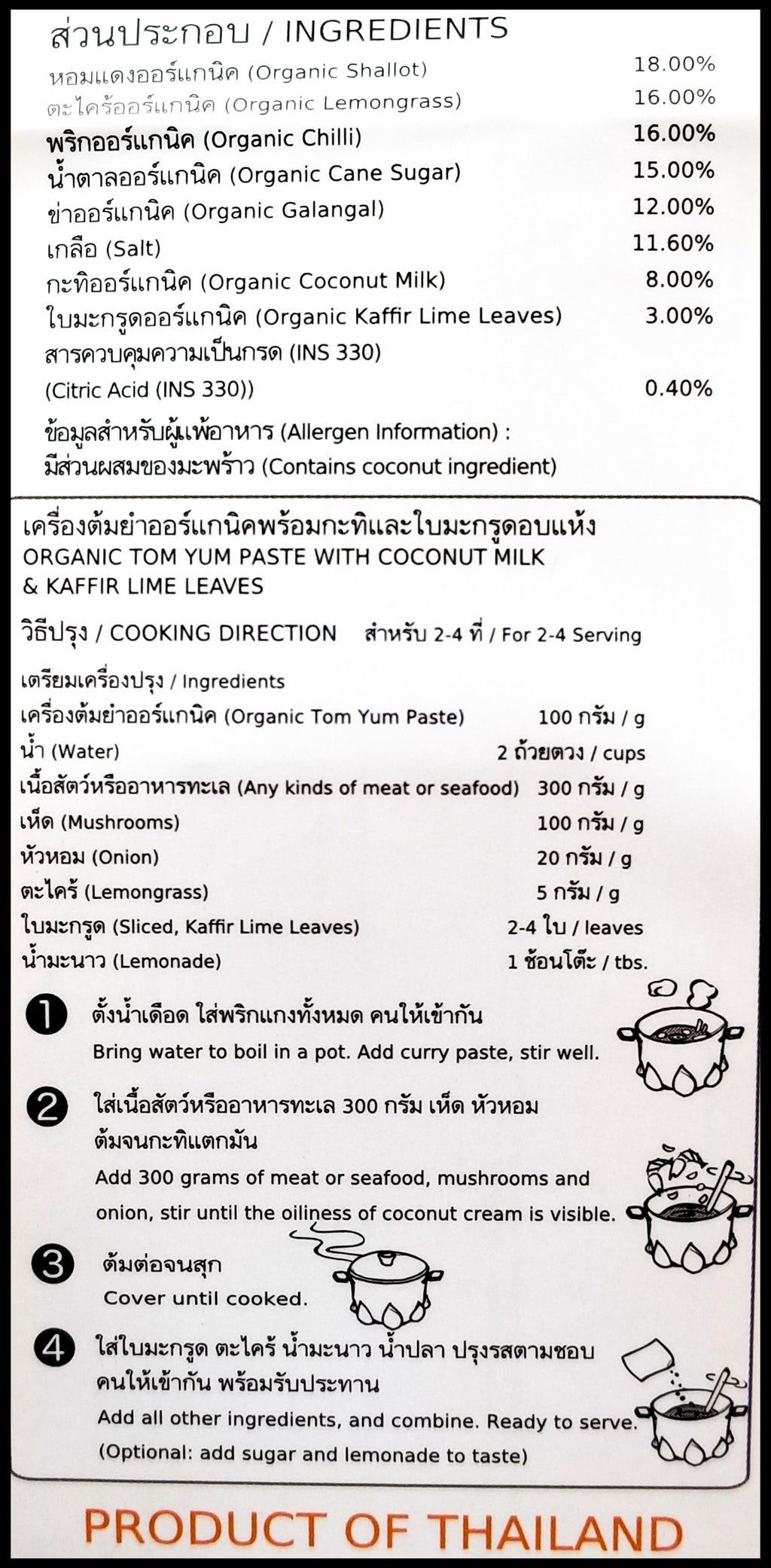 Organic Shallot, Organic Chili, Organic Lemongrass, Organic Cane Sugar, Organic Galangal, Salt, Organic Coconut milk, Organic Kaffir lime Leaves, Citric Acid (INS 330).