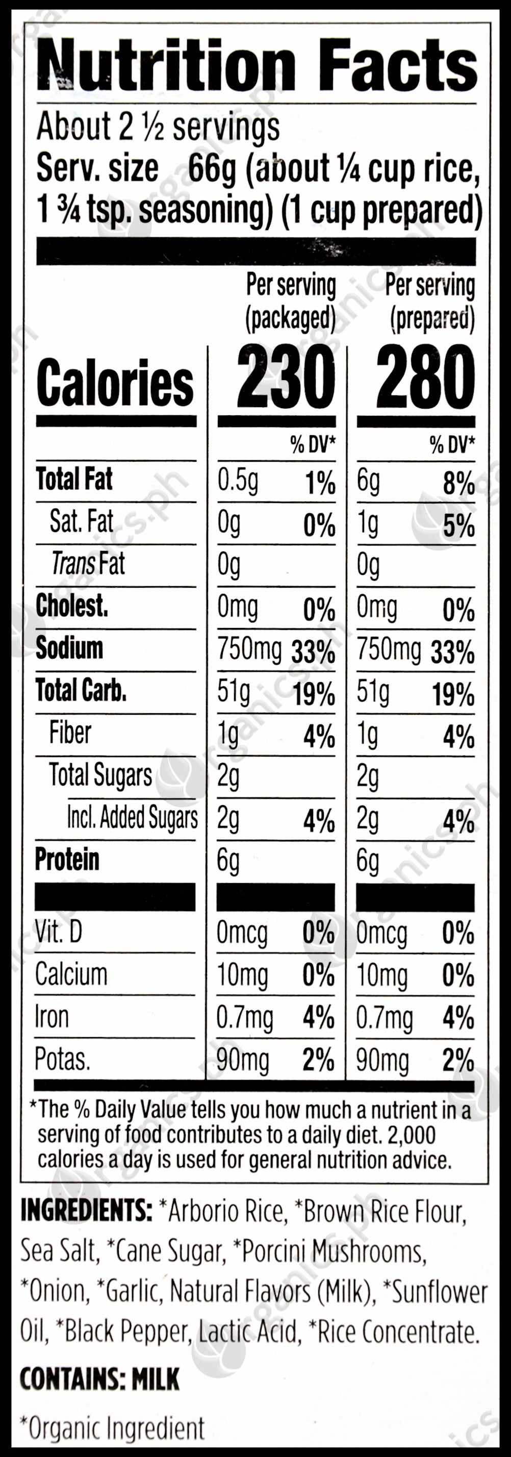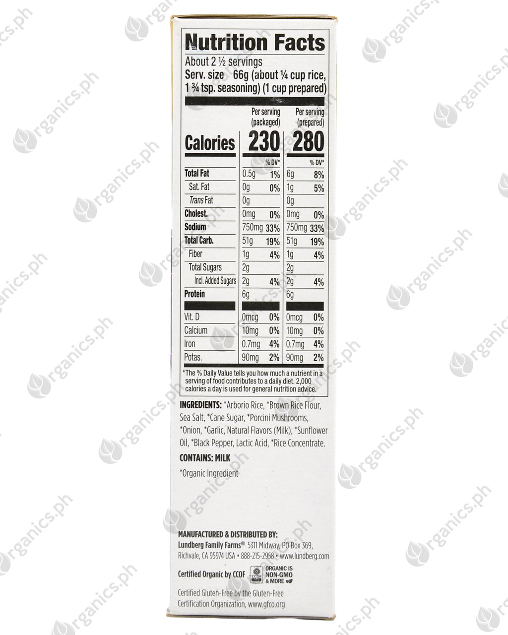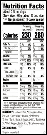Organic Arborio Rice, Organic Brown Rice Flour, Sea Salt, Organic Cane Sugar, Organic Porcini Mushrooms, Organic Onion, Organic Garlic, Natural Flavors (Milk), Organic Black Pepper, Lactic Acid.