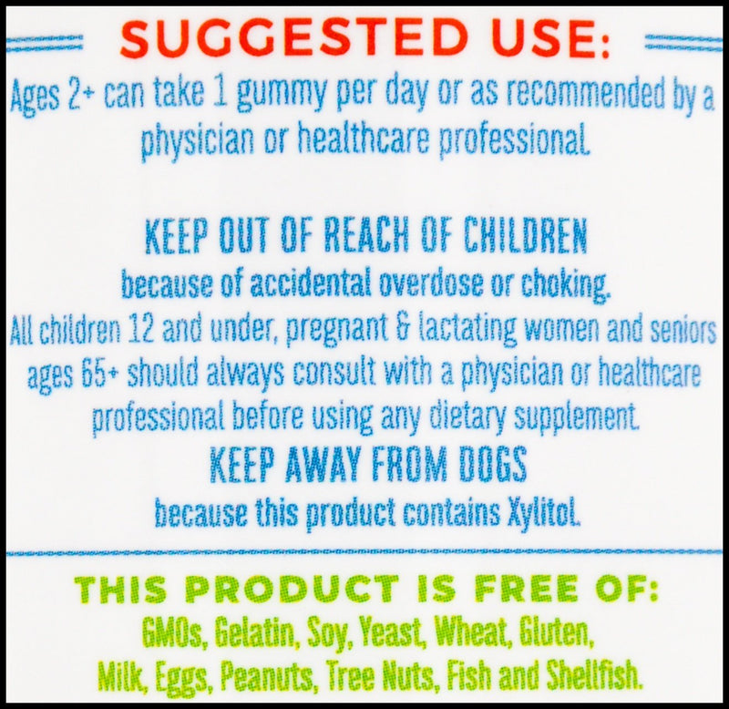 • Made With Organic Ingredients | Non-GMO Vegan | Pectin Based | No Gelatin | Dairy Free | Nut Free | Gluten & Wheat Free | Soy Free | Corn Free | Nightshade Free | Sugar Free | Celiac Friendly  | Made in a GMP Facility | Formulated For Kids!