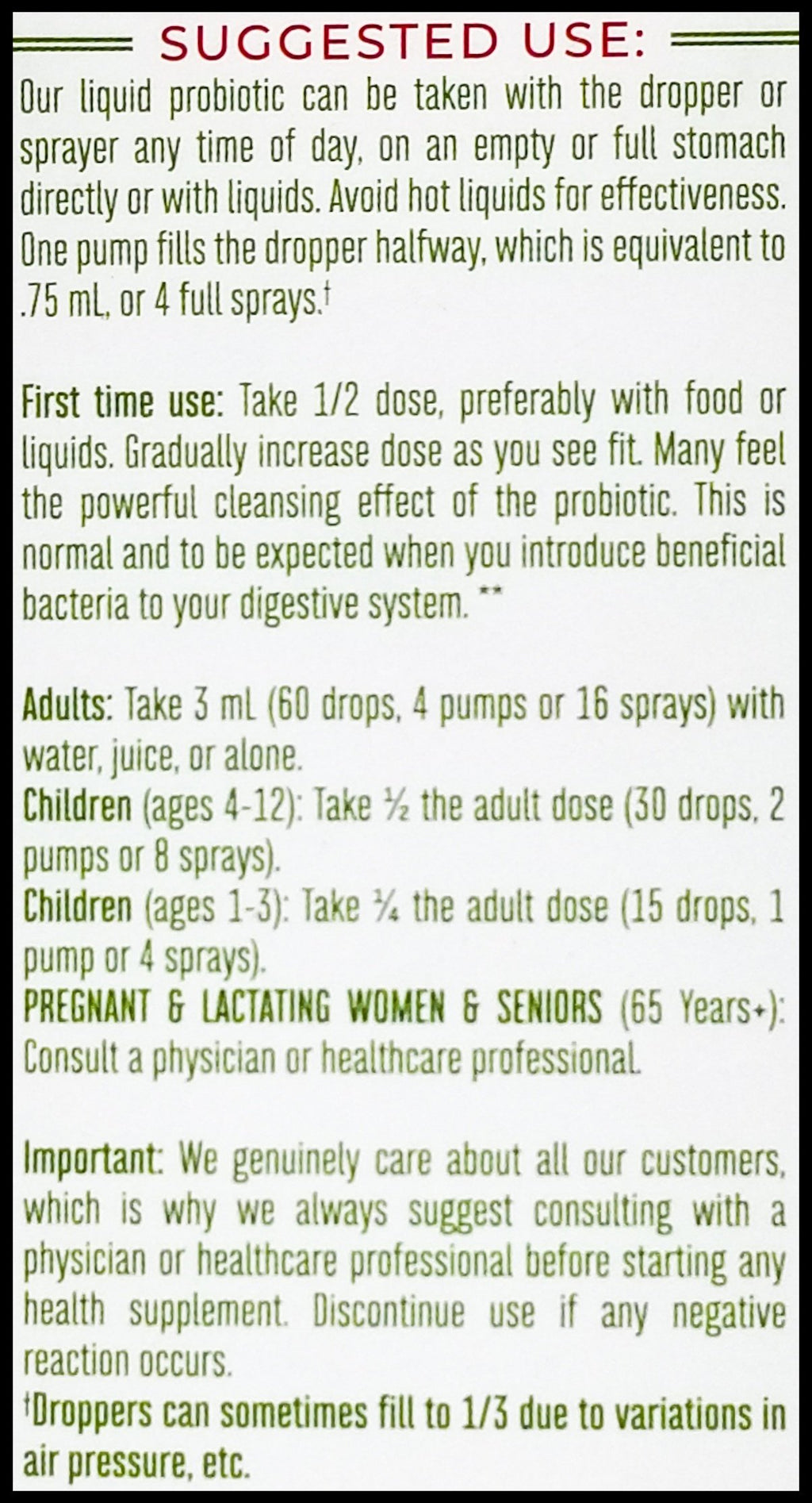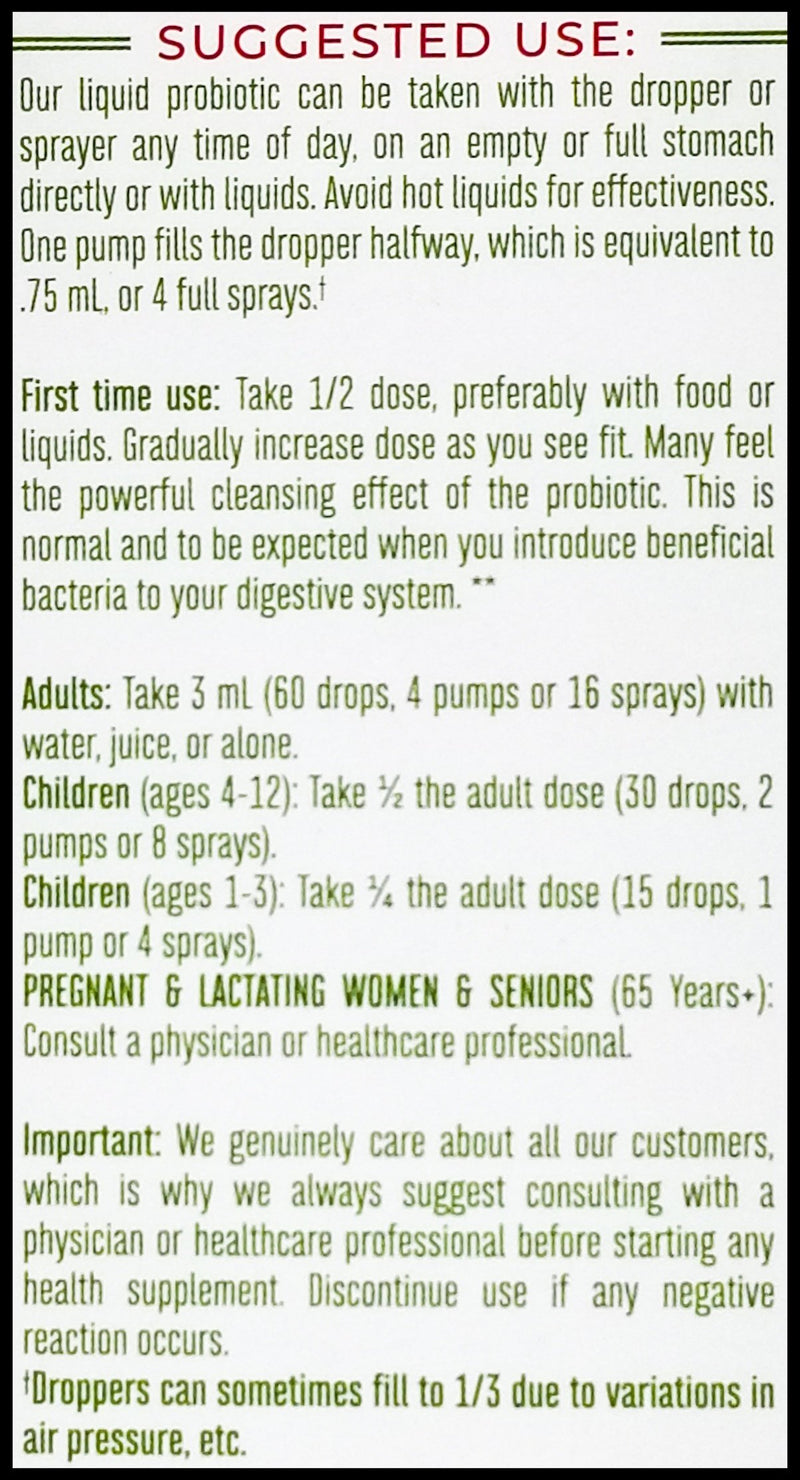 Suggested Use: Our liquid probiotic can be taken with the dropper or sprayer any time of day, on an empty or full stomach directly or with liquids. Avoid hot liquids for effectiveness. One pump fills the dropper halfway, which is equivalent to 0.75 mL, or 4 full sprays✝.