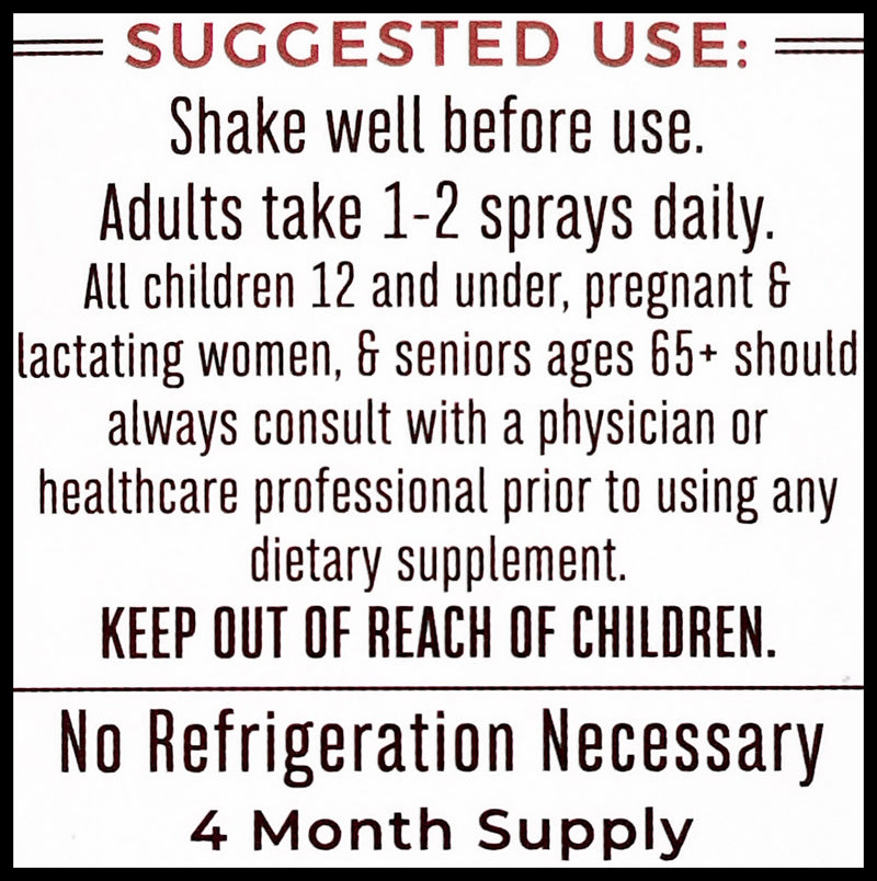 Shake well before use. Adults take 2 sprays or as recommended by a physician or healthcare professional.