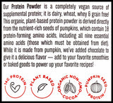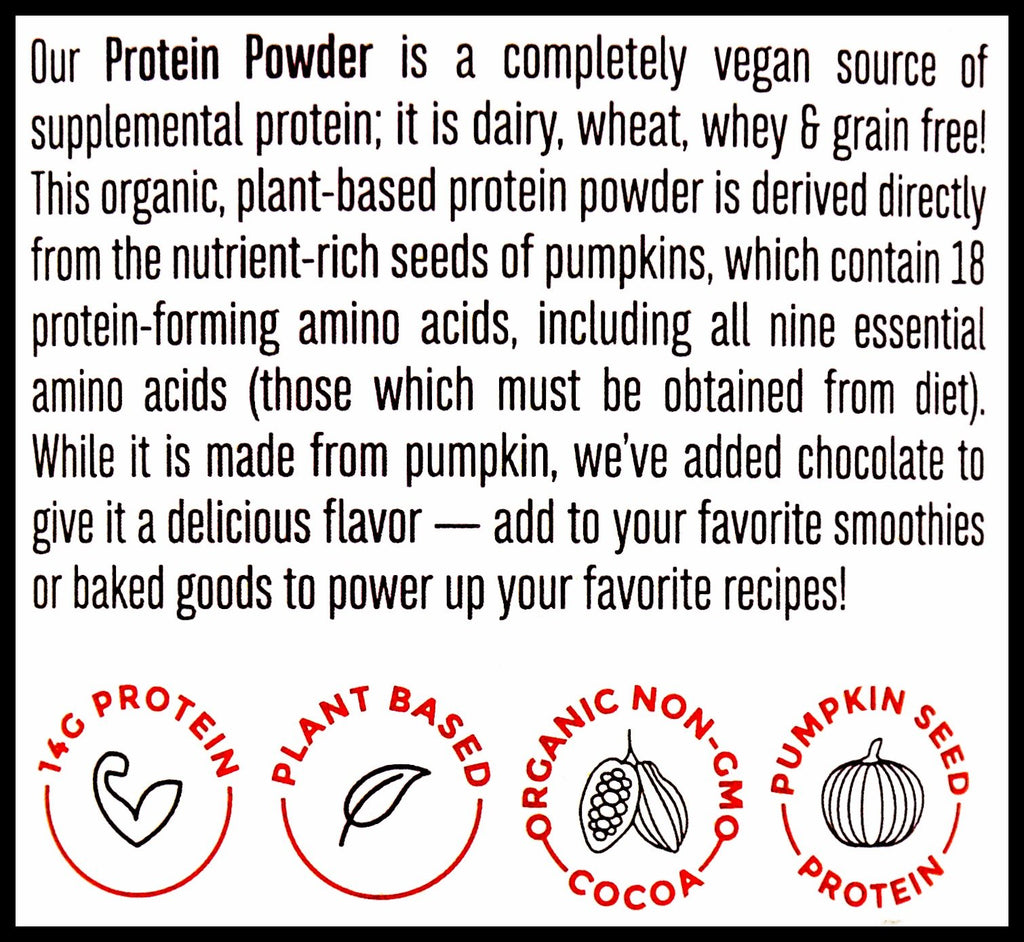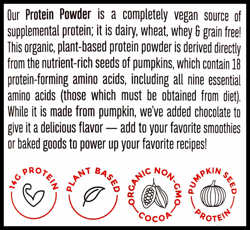 - Our Protein Powder is a completely vegan source of supplemental protein; it is dairy-free, whey-free & grain-free! This organic, plant-based protein powder is derived directly from the nutrient-rich seeds of pumpkins, which contain 18 protein-forming amino acids, including all nine essential amino acids (those which must be obtained from the diet). While it is made from pumpkin, we’ve added fair trade chocolate to give it a delicious flavor.