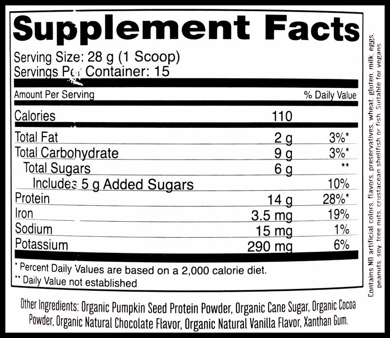 Per Serving (1 Scoop): 14 g Organic Pumpkin Seed Protein Powder.