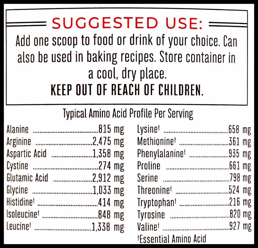 Suggested Use: Add one scoop (28 g) to food or drink of choice; we prefer this protein powder blended into a coconut milk-based smoothie or added to baked goods!