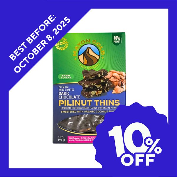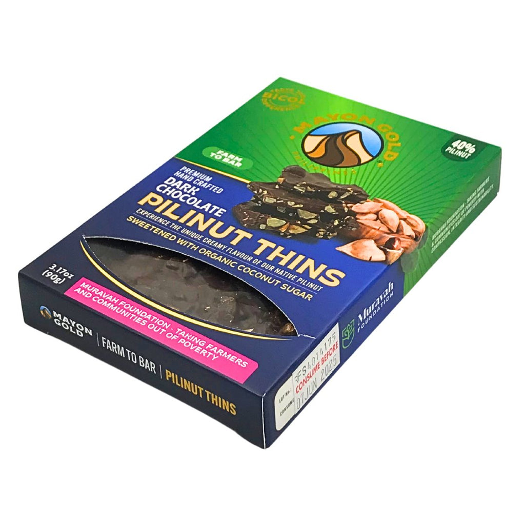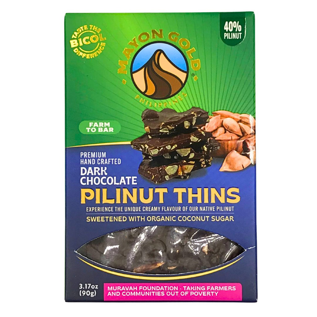 - Indulge in the rich crunch of Mayon Gold Pili Nut Thins. Made with thin chocolate bark and premium pili nuts, this snack is a delicious and satisfying treat. Experience the perfect balance of sweetness and nuttiness with every bite. Each bag contains 100% real ingredients for a guilt-free indulgence.