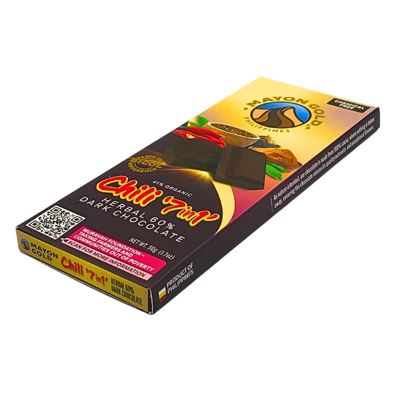 - Indulge in a unique chocolate experience with Mayon Gold Chili 7in1 Herbal 60% Dark Chocolate Bar. Crafted with a blend of chili and 7 other spices, this bar offers a spicy kick to your taste buds. Made with premium quality ingredients, it's a delicious and healthy treat for chocolate lovers.