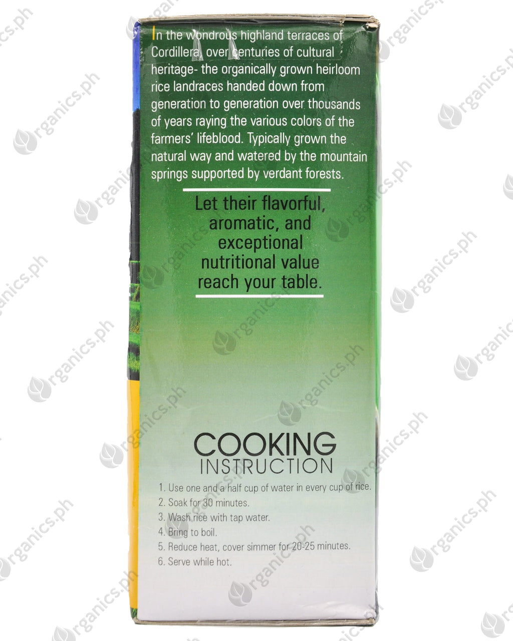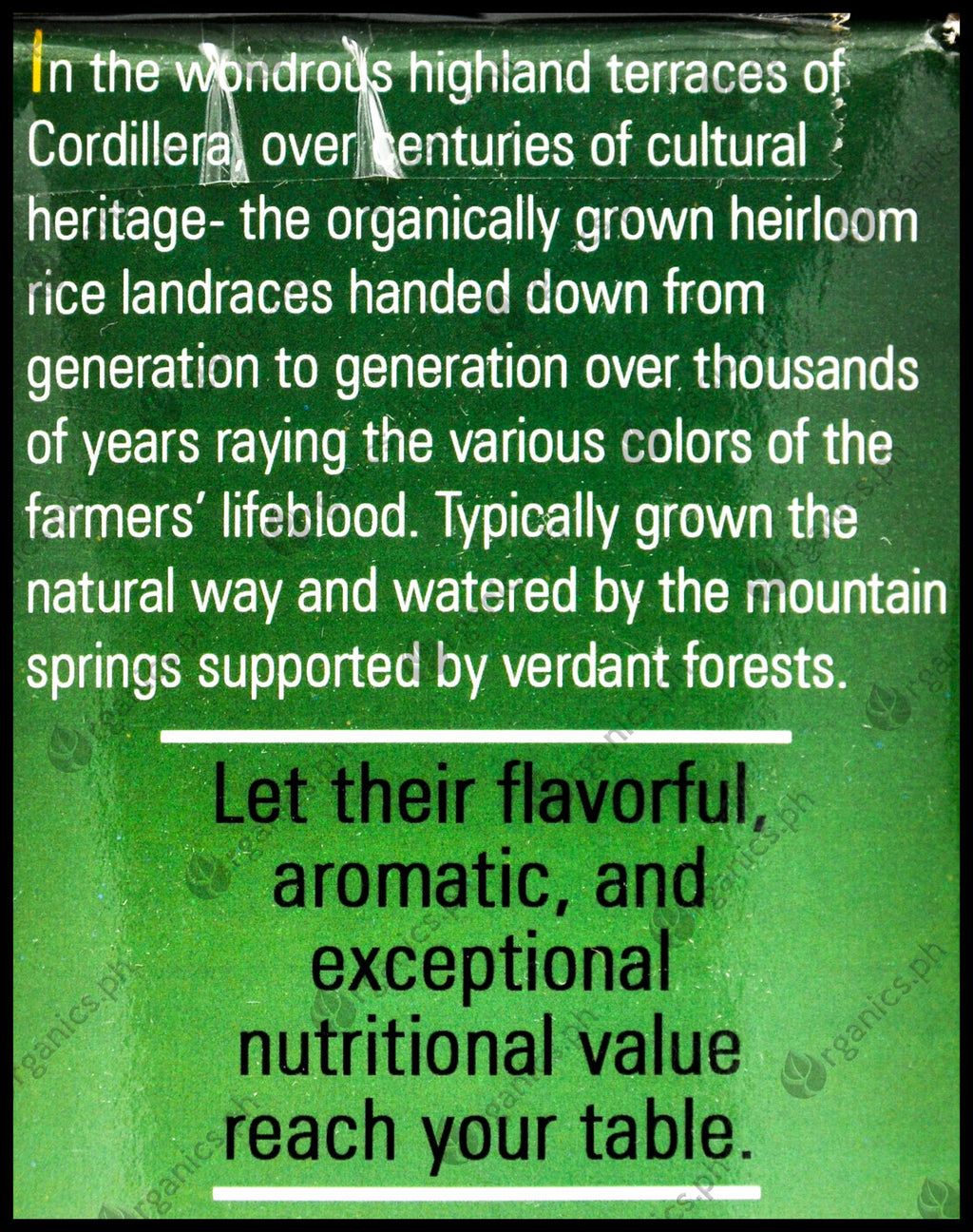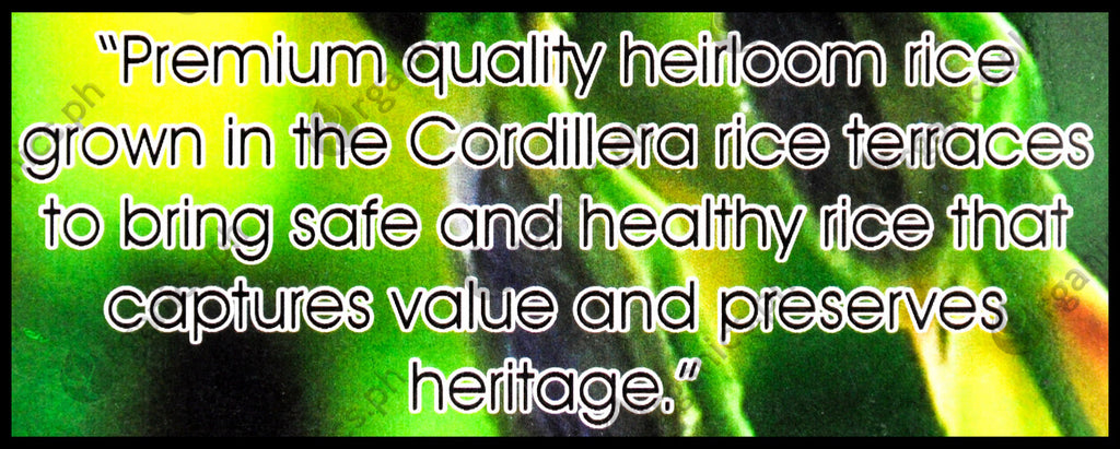 - Premium quality heirloom rice grown in the Cordillera rice terraces to bring safe and healthy rice that captures value and preserves heritage.
