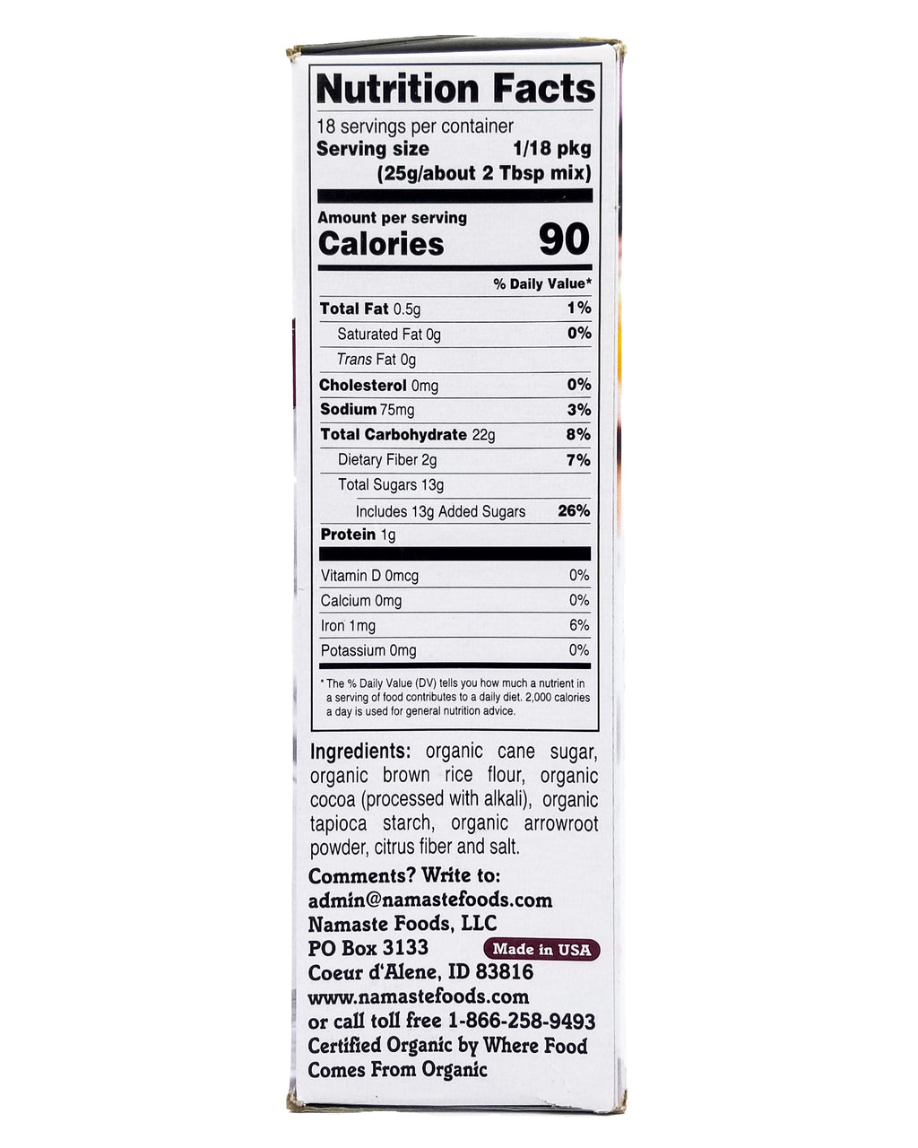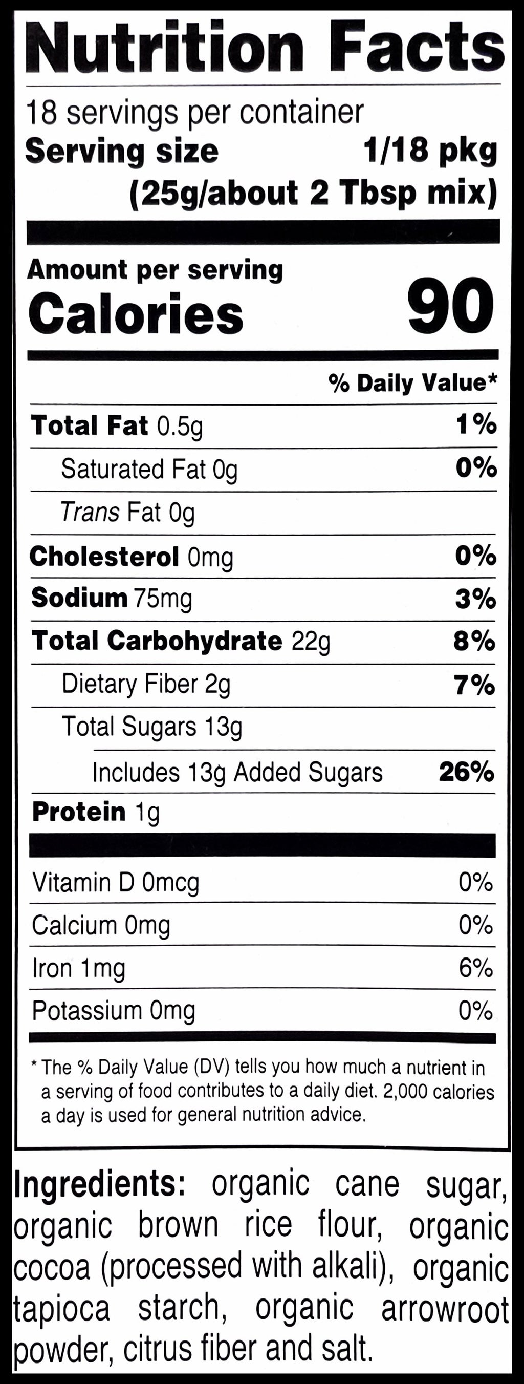 Organic cane sugar, organic brown rice flour, organic cocoa (processed with alkali), organic tapioca starch, organic arrowroot powder, citrus fiber and salt.