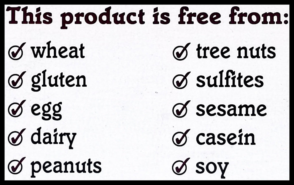 FREE FROM: Wheat, gluten, dairy, egg, peanuts, tree nuts, soy, fish, shellfish, sulfites, sesame and mustard.