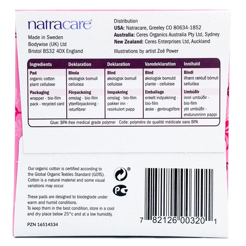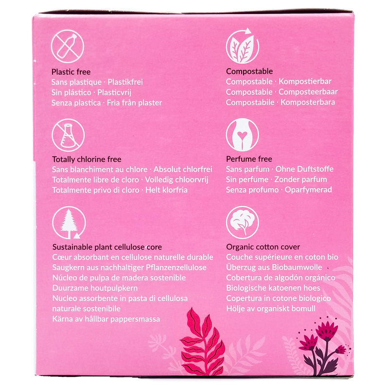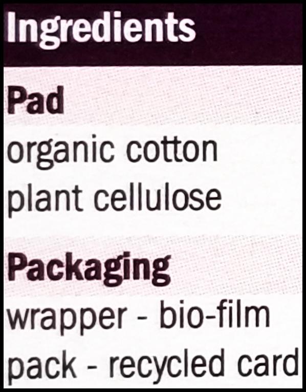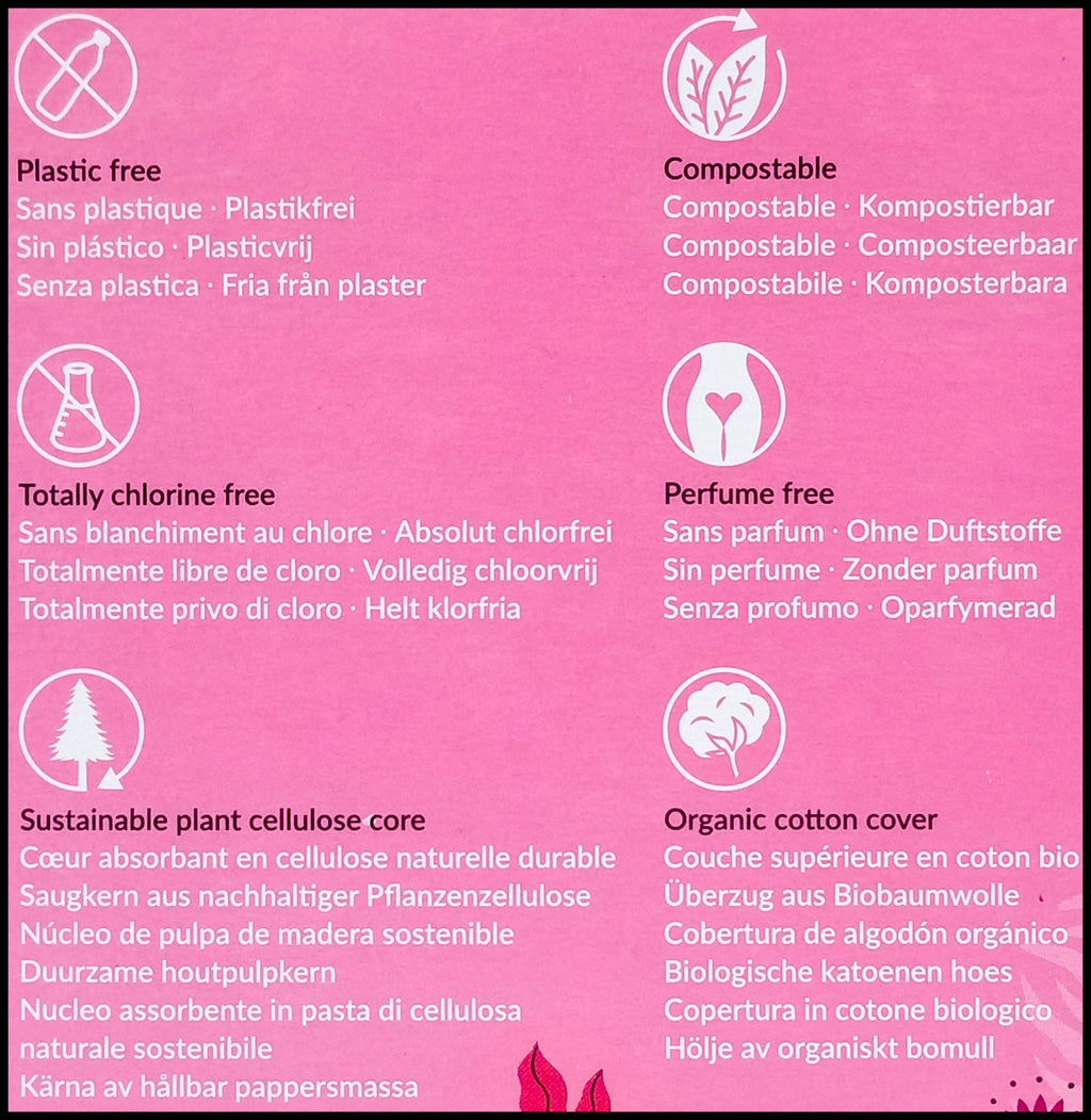 Pad: Certified organic cotton, ecologically certified cellulose pulp, plant starch, non-toxic glue.