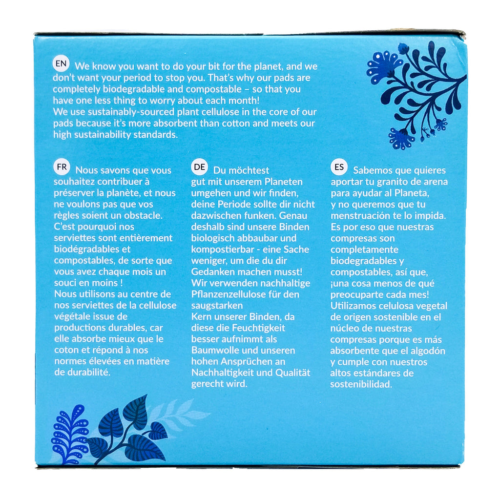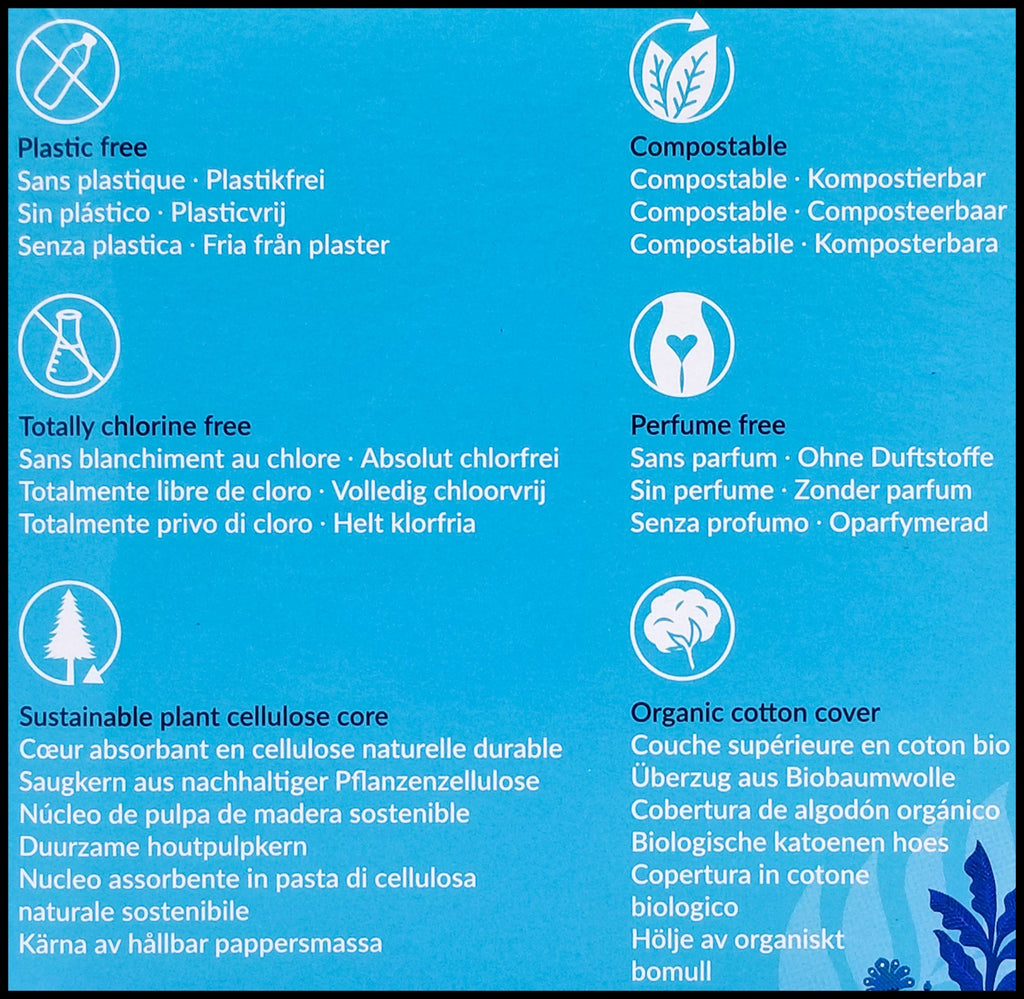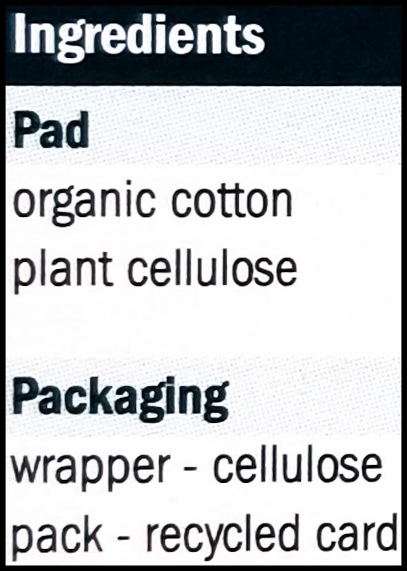 Pad: Certified organic cotton, ecologically certified cellulose pulp, plant starch, non-toxic glue.