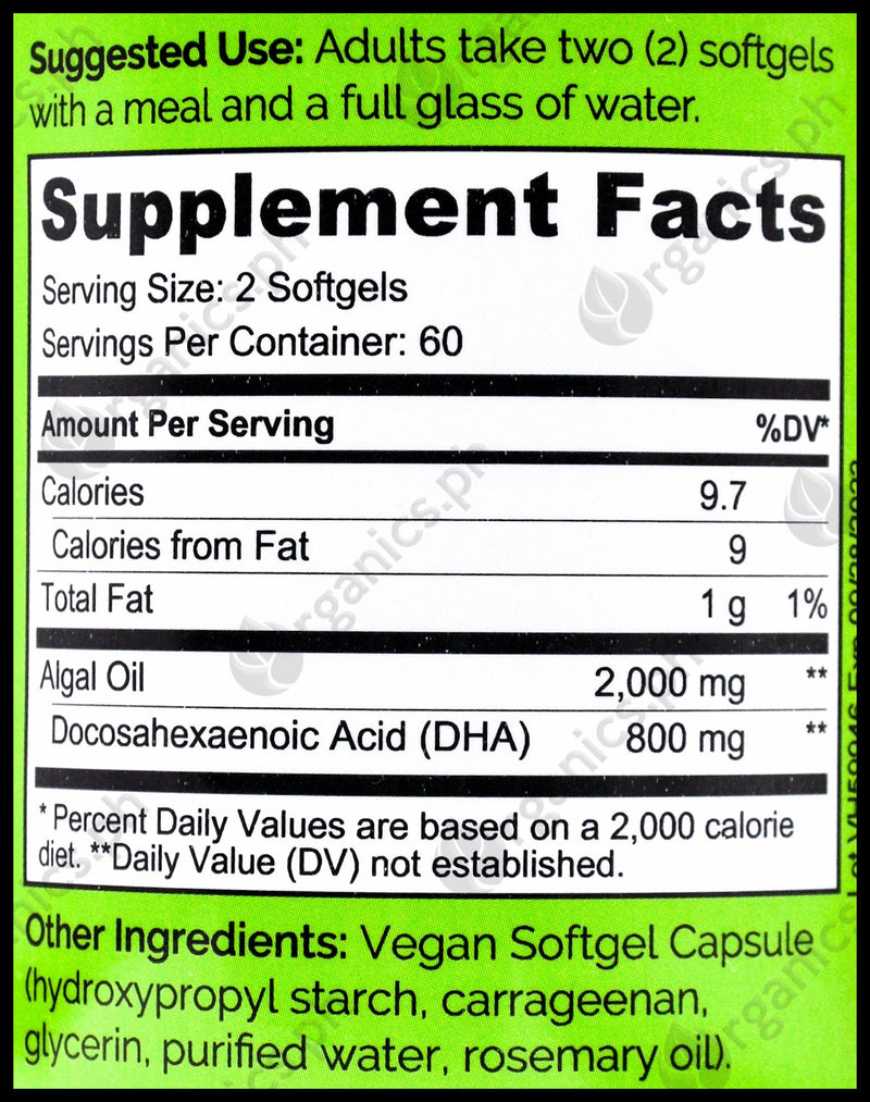 Naturelo Vegan Omega-3 Algae 800mg DHA (120 softgels, 60 servings)