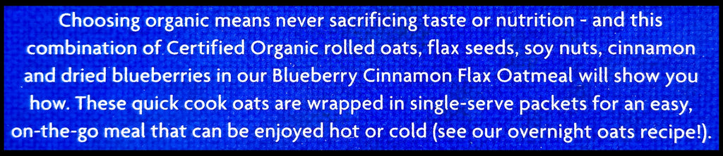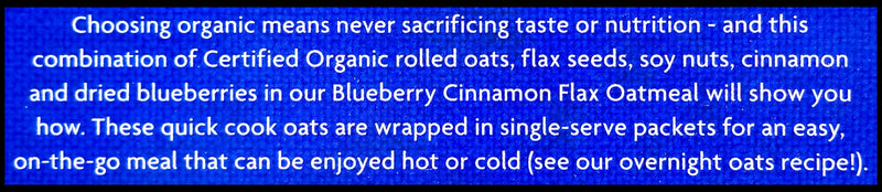 - Our Blueberry Cinnamon Flax Oatmeal is a great way to start the day: they’re easy to prepare, and each packet yields a hearty, filling bowl of organic whole grain oats, dried blueberries, flax seeds, and warming cinnamon.