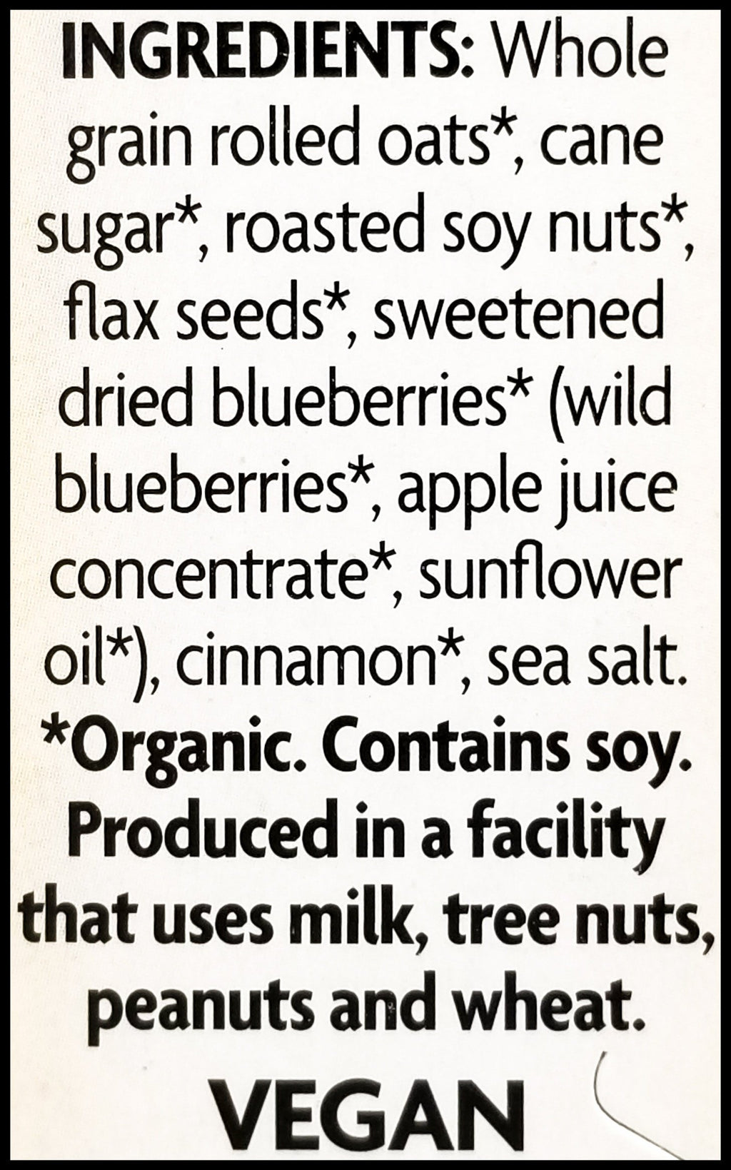 Whole grain rolled oats*, cane sugar*, roasted soy nuts*, flax seeds*, sweetened dried blueberries* (wild blueberries*, apple juice concentrate*, sunflower oil*), cinnamon*, sea salt. (*Organic).