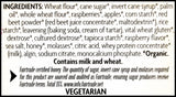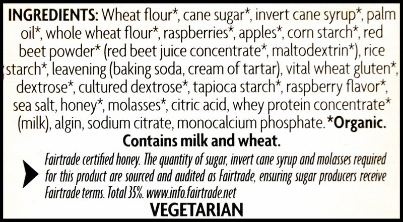 Wheat flour*, cane sugar*, invert cane syrup*, palm oil*, whole wheat flour*, raspberries*, apples*, corn starch*, red beet powder* (red beet juice concentrate*, maltodextrin*), rice starch*, leavening (baking soda, cream of tartar), vital wheat gluten*, dextrose*, cultured dextrose*, tapioca starch*, raspberry flavor*, sea salt, honey*, molasses*, citric acid, whey protein concentrate* (milk), algin, sodium citrate, monocalcium phosphate. (*Organic).