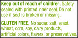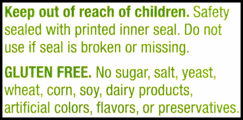 Does not contain: Sugar, Salt, Yeast, Gluten, Corn, Soy, Dairy Products, Artifical Colors, Artificial Flavors, Wheat, Preservatives.