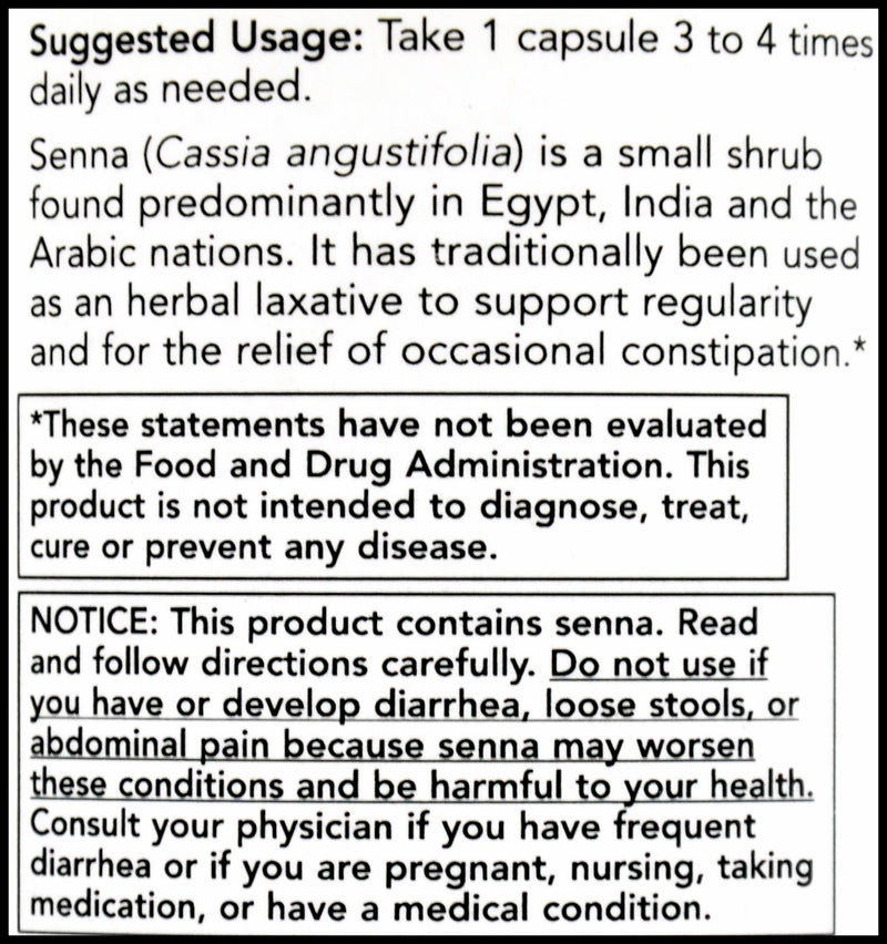 Notice: This product contains senna. Read and follow directions carefully. Do not use if you have or develop diarrhea, loose stools, or abdominal pain because senna may worsen these conditions and be harmful to your health. Consult your physician if you have frequent diarrhea or if you are pregnant, nursing, taking medication, or have a medical condition.