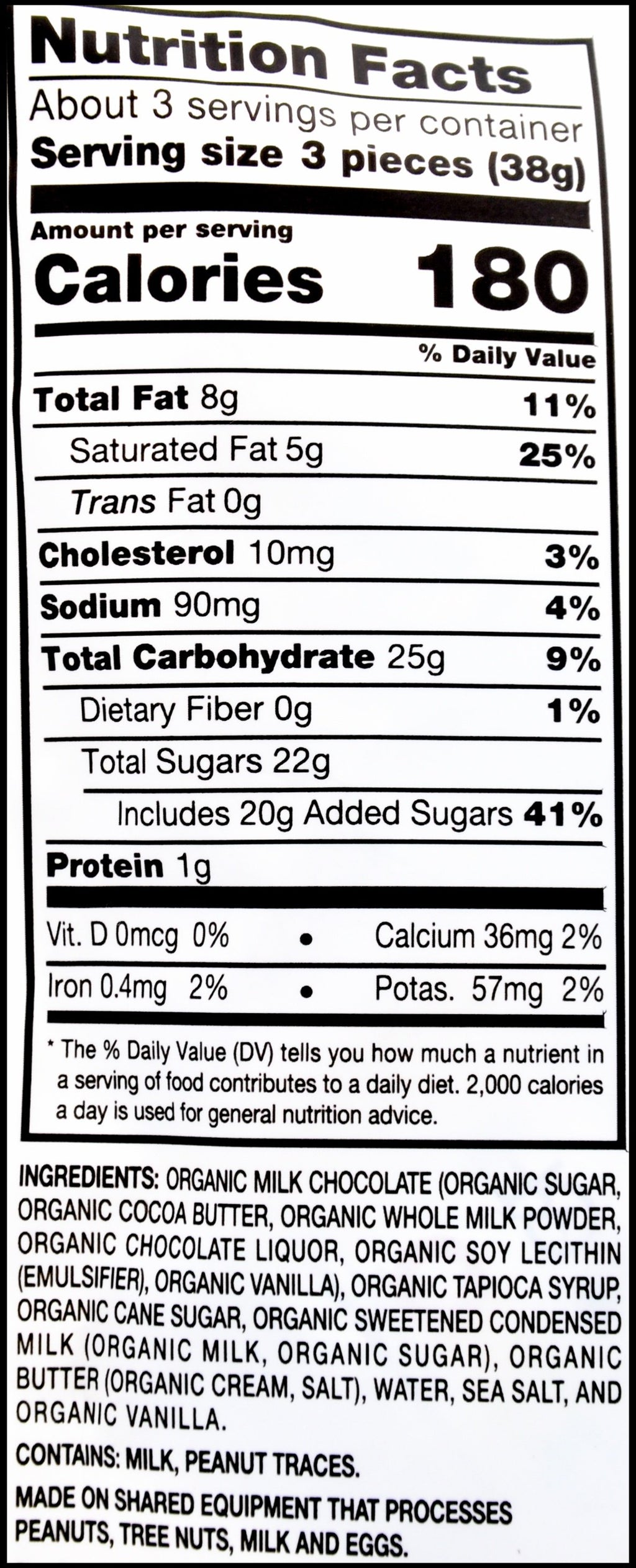 *Milk Chocolate (*Sugar, *^Cocoa Butter, *Whole Milk Powder, *^Chocolate Liquor, *Soy Lecithin (Emulsifier), *Vanilla), *Tapioca Syrup, *Cane Sugar, *Sweetened Condensed Milk (*Milk, *Sugar), *Butter (*Cream, Salt), Water, Sea Salt, And *Vanilla Bean.