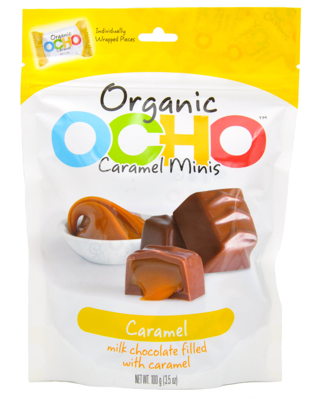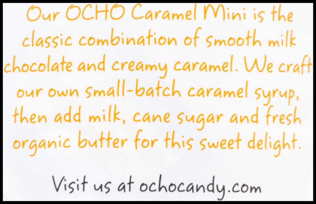 - Our OCHO Caramel Mini is the classic combination of creamy caramel and milk chocolate. We make the caramel from scratch using fresh organic butter and organic cane sugar and then cover it with the finest organic chocolate.