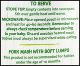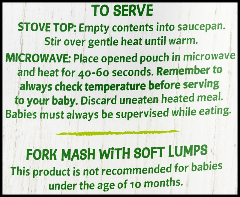 MICROWAVE: Place opened pouch in microwave and heat for 40-60 seconds. Remember to always check temperature before serving to your baby. Discard uneaten heated meal. Babies must always be supervised while eating.