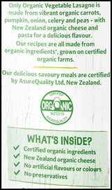 - New Zealand organic cheese and pasta combined with a delicious medley of vibrant organic carrots, pumpkin, onion, cereal and peas creates a nourishing traditional meal with a delicious flavor. Serve warm for lunch or dinner.