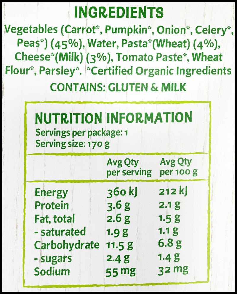 Vegetables (Carrot*, Pumpkin*, Onion*, Celery*, Peas*) (45%), Water, Pasta* (Wheat) (4%), Cheese*(Milk) (3%), Tomato Paste*, Wheat Flour*, Parsley*.