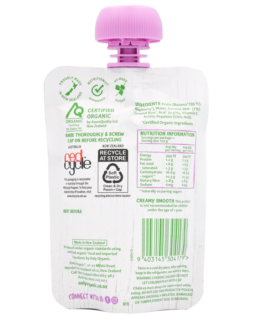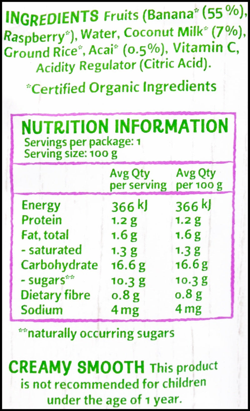 Fruits (Banana* (53%), Raspberry*), Water, Ground Rice*, Coconut Milk* (5%), Acai* (0.5%), Vitamin C, Acidity Regulator (Citric Acid).