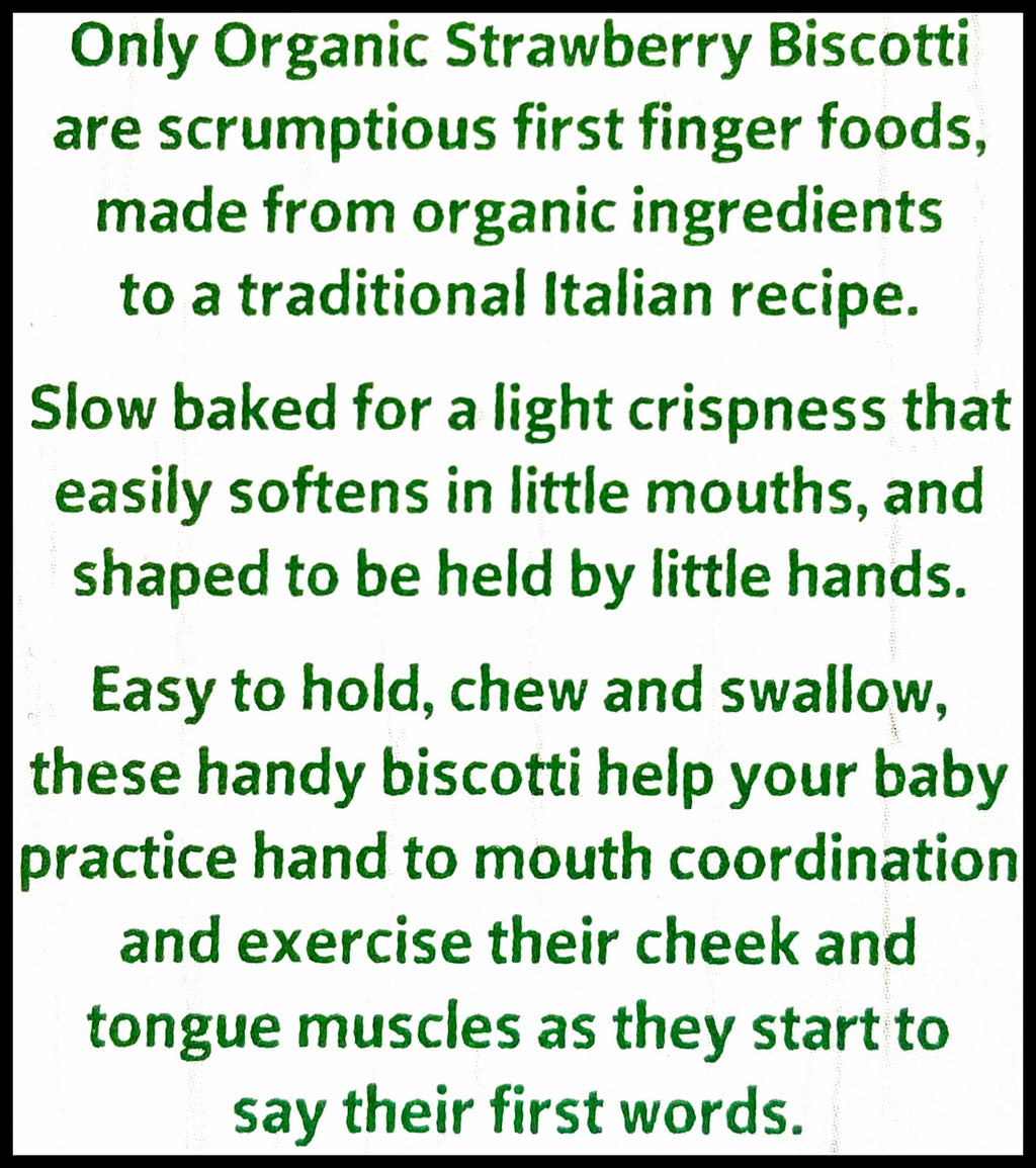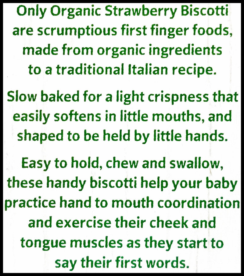 - Scrumptious finger foods, our biscotti are made from organic ingredients to a traditional Italian recipe. They are slow baked for a light crispness that easily softens in little mouths. Easy to hold, chew and swallow, these handy biscotti help your baby practice hand to mouth coordination and exercise their cheek and tongue muscles as they start to say their first words.