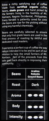 - Our coffee is proudly made from 100% naturally grown coffee beans, shade-grown, and handpicked by the farmers living in the foothills of Mt. Kanlaon, Negros Occidental.