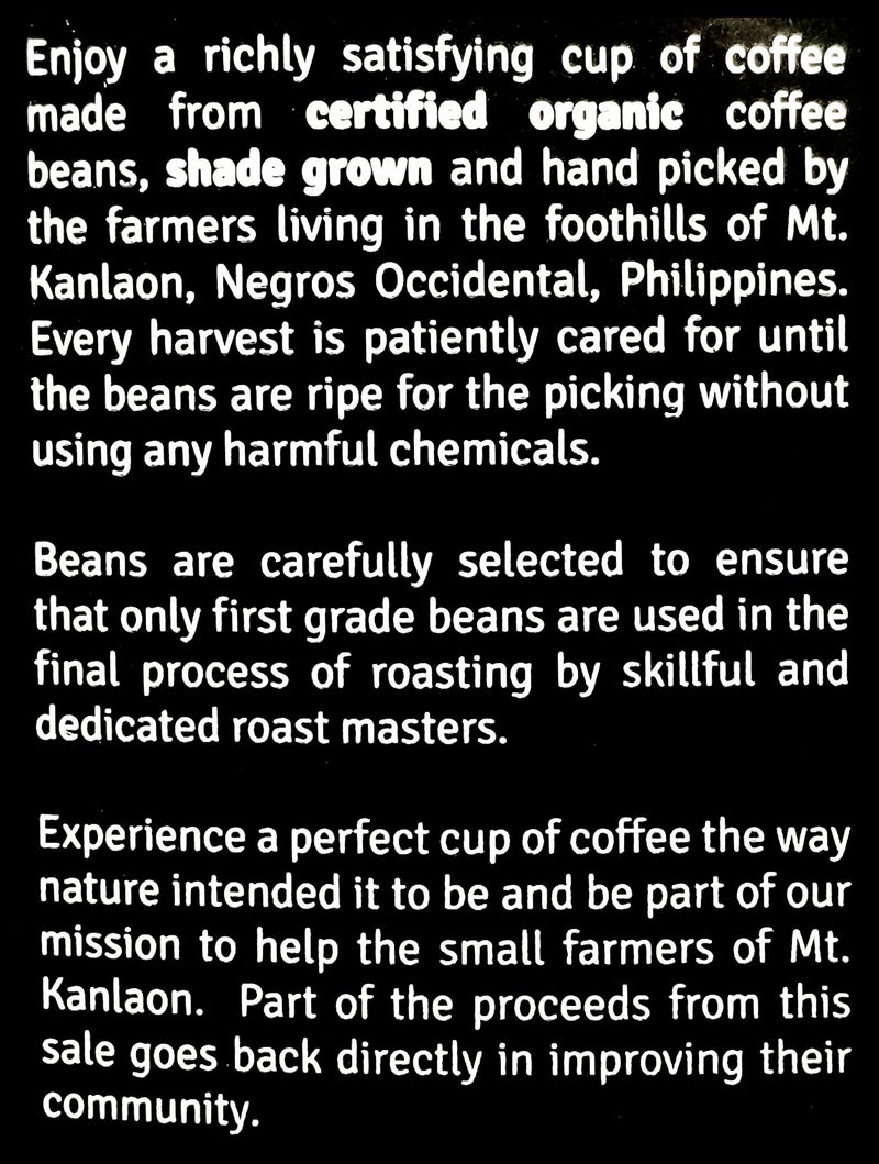 - Our coffee is proudly made from 100% naturally grown coffee beans, shade-grown, and handpicked by the farmers living in the foothills of Mt. Kanlaon, Negros Occidental.