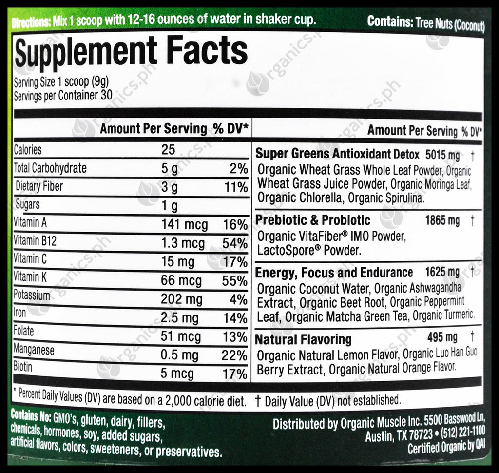 Certified Organic Wheat Grass Whole Leaf Powder, Certified Organic Wheatgrass Juice Powder, Certified Organic Chlorella, Certified Organic Moringa Leaf, Certified Organic Spirulina.