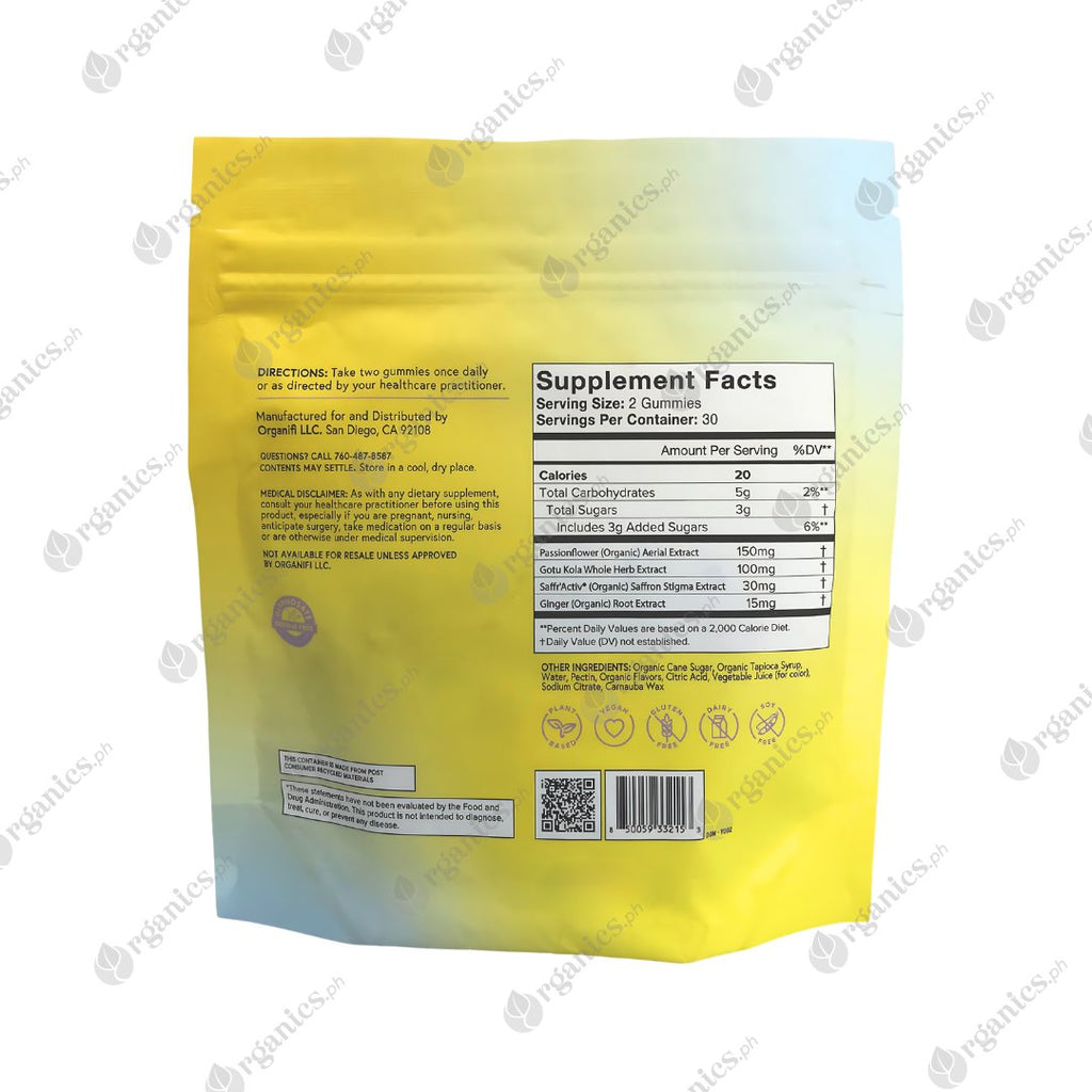 Organic Passionflower (aerial extract), Gotu Kola (whole herb extract), Organic Saffr’Activ® (Organic Saffron stigma extract), Organic Ginger root extract, Organic Cane Sugar, Organic Tapioca Syrup, Water, Gelling Agent (Pectin), Organic Flavours, Citric Acid (as acidity regulator), Vegetable Juice (for colour), Sodium Citrate (acidity regulator), Carnauba Wax (glazing agent)