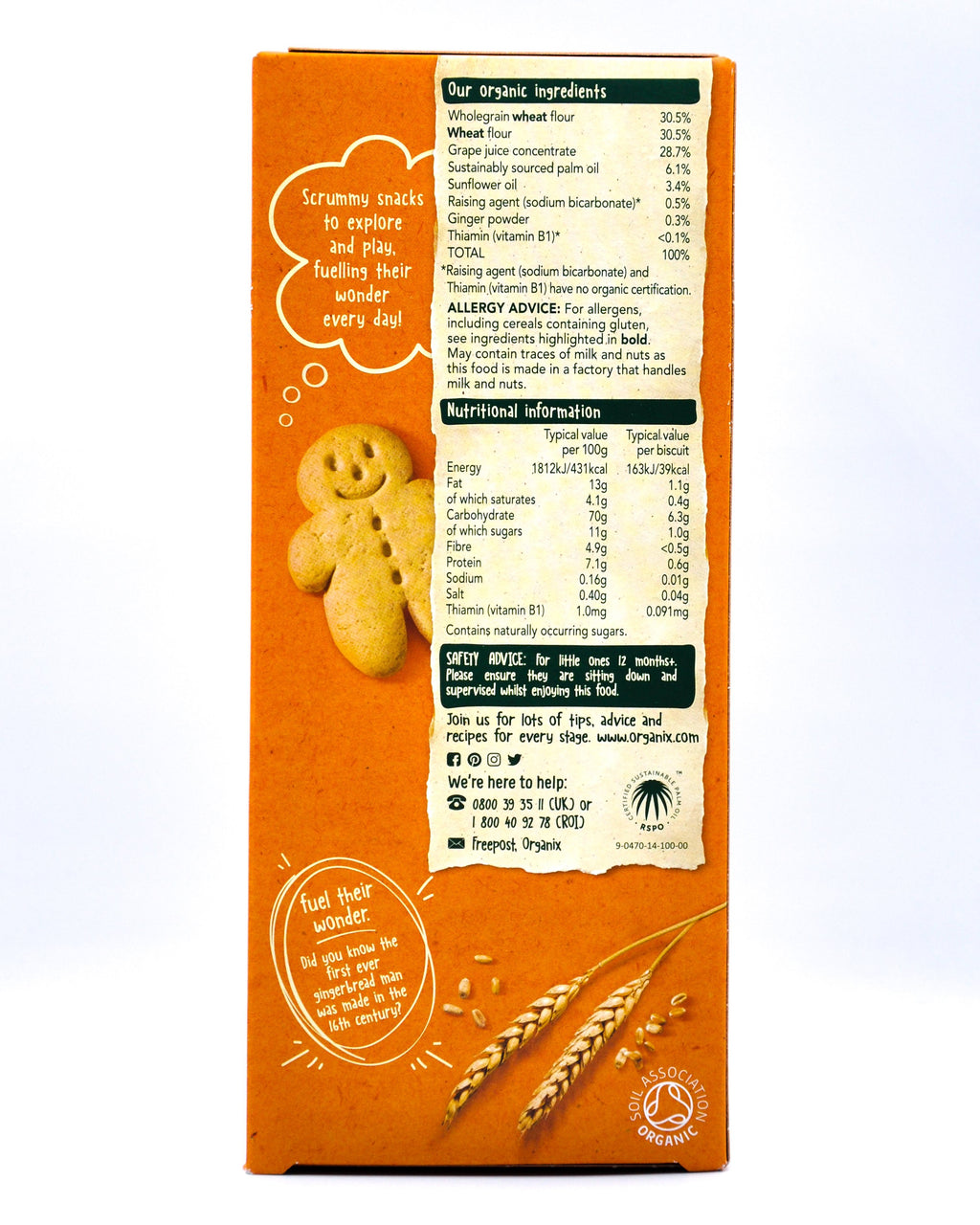Organic Wholegrain Wheat Flour, Organic Wheat Flour, Organic Grape Juice Concentrate, Organic Sustainably Sourced Palm Oil, Organic Sunflower Oil, Organic Ginger Powder, Raising Agent* (sodium bicarbonate), Thiamin* (vitamin B1)