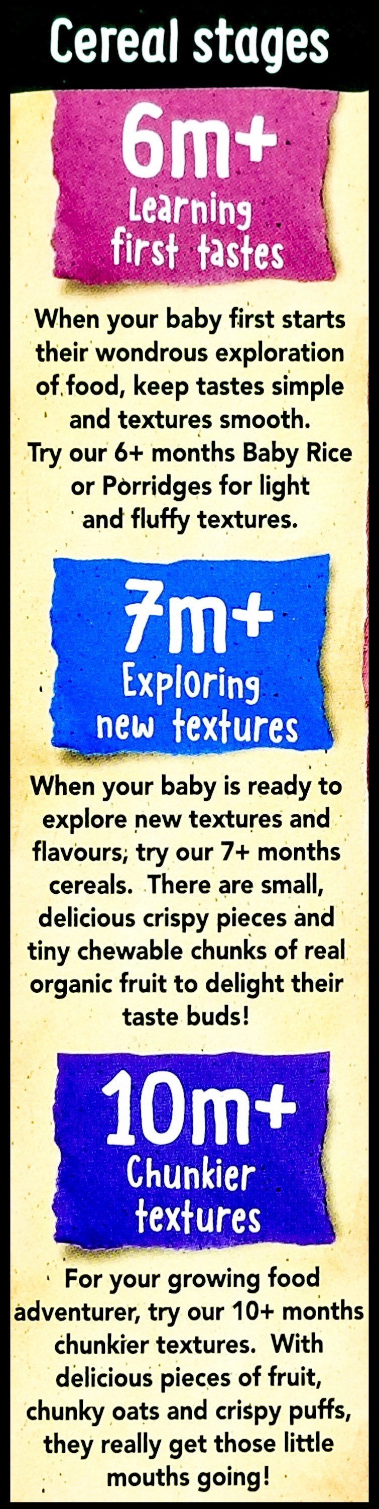 - Our organic baby muesli cereal is an exciting new taste sensation for little learners made with real fruit pieces, puffed rice and wholegrain oat flakes. Perfect for growing taste buds and getting little mouths really chewing!