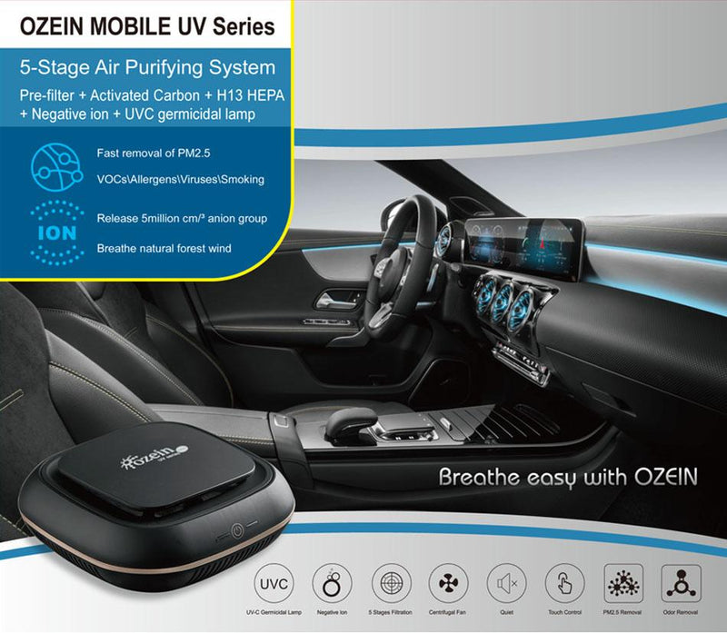 - Ozein Mobile UV Series can free your car from the worst of air pollutants. You can breathe easy knowing that Ozein is 99.99% effective in removing airborne contaminants that include dust, pollen, smoke, pet dander (skin flakes), mold, dioxin, formaldehyde and even radon decay byproducts. It is also effective in killing virus and bacteria that pass through its system. With Ozein Mobile you can create an atmosphere of wellness and turn your car into a clean breathing space that your family deserves.