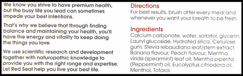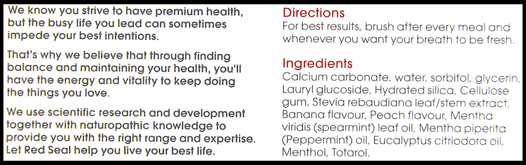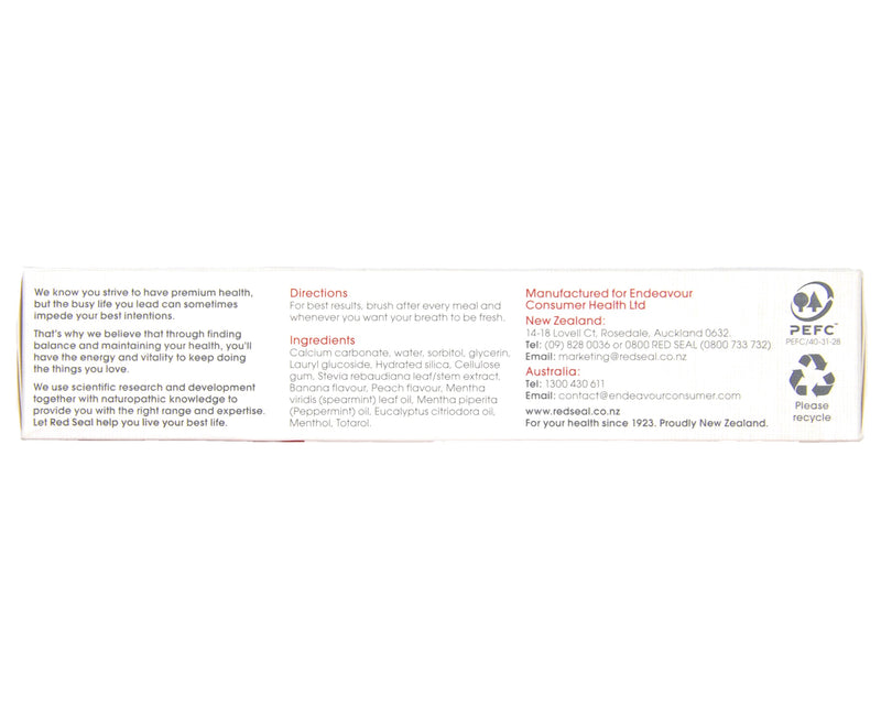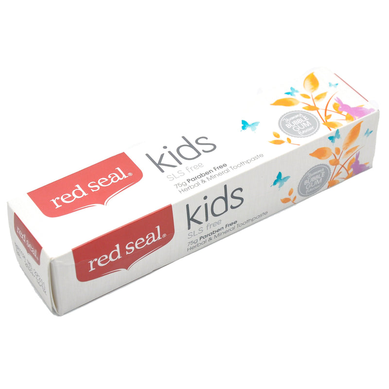 - Red Seal Kids SLS free natural toothpaste has been specially formulated for young children - with no added fluoride, SLS Free and yummy banana and peach "bubble-gum" flavor with low mint tones. Inspired by Nature, Red Seal natural toothpastes have been manufactured in New Zealand for over 30 years (from local and imported ingredients).
