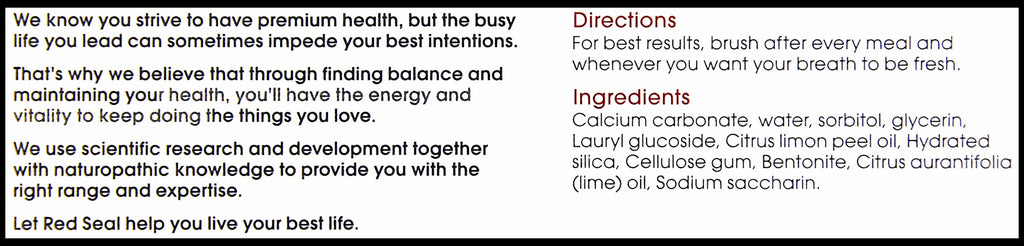 - Red Seal Lemon SLS Free Natural Toothpaste is Mint Free - for those who dislike or are allergic to mint. Contains natural lemon and lime oils for a refreshing lemon flavor. Plus SLS Free (low foaming) offers a more natural option for oral hygiene. Inspired by Nature, Red Seal natural toothpastes have been manufactured in New Zealand for over 30 years (from local and imported ingredients) with no added fluoride.