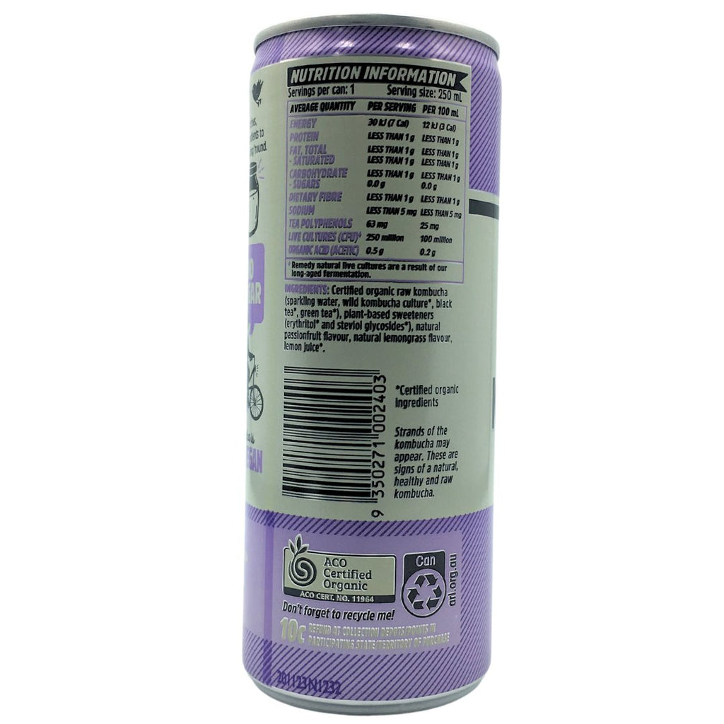 Ingredients - Certified organic raw kombucha (sparkling water, wild kombucha culture, black tea*, green tea*), plant-based sweeteners (erythritol* and steviol glycosides*), natural passionfruit flavour, natural lemongrass flavour, lemon juice*
