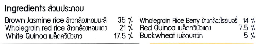Brown Jasmine Rice 35%, Wholegrain Red Rice 21%, White Quinoa 17.5%, Wholegrain Rice Berry 14%, Red Quinoa 7.5%, Buckwheat 5%.