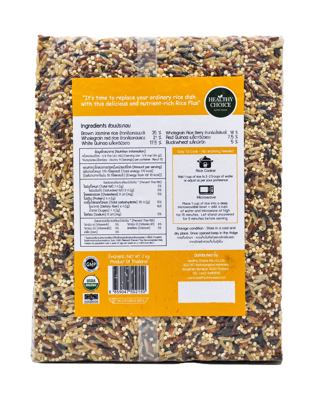 - Rice plus contains a perfect blend of the mixed organic wholegrain rice (brown Jasmine rice, red rice and Thai rice berry) and the ancient superfood grains (red quinoa, white quinoa and buckwheat), the excellent source of plant based complete protein and fiber.