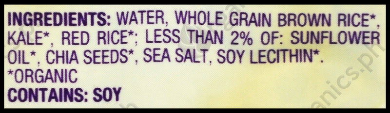 Water, Whole Grain Brown Rice, Kale, Red Rice, Sunflower Oil, Chia Seeds, Sea Salt, Soy Lecithin, Guar Gum, Locust Bean Gum.