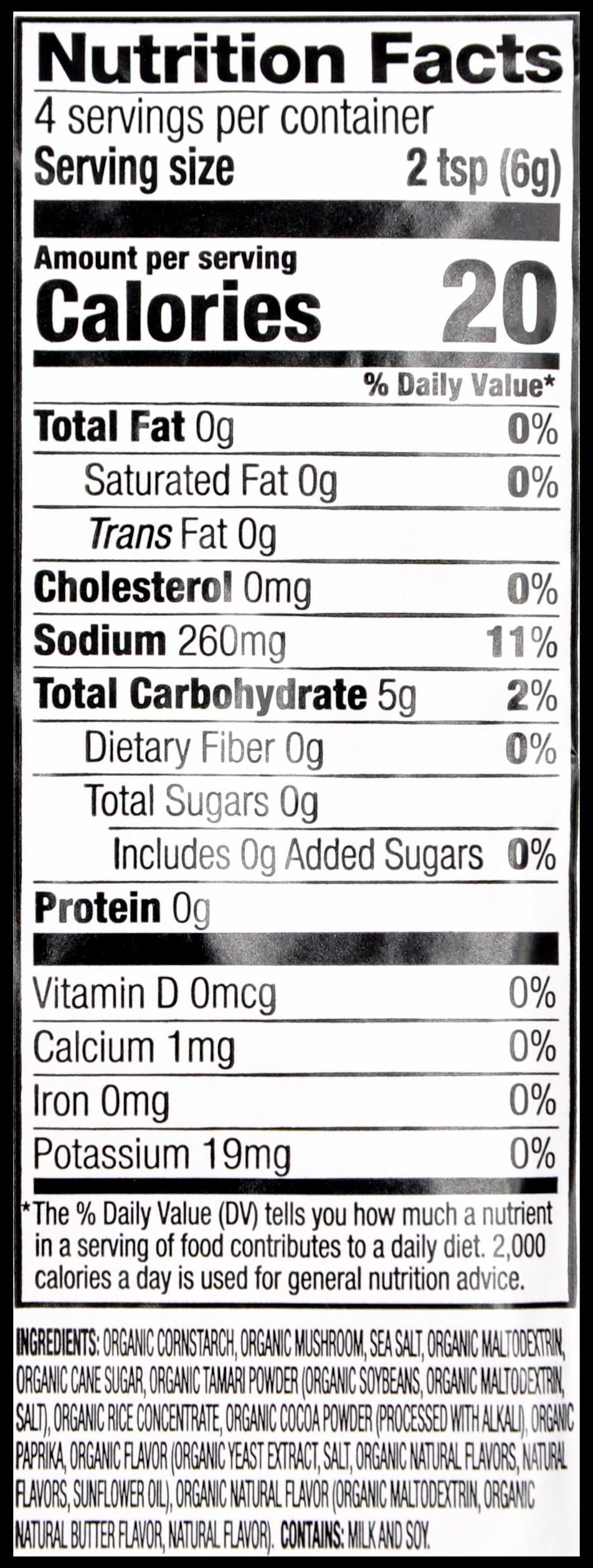 Organic Cornstarch, Organic Mushrooms, Sea Salt, Organic Maltodextrin, Organic Cane Sugar, Organic Tamari Powder (Organic Soybeans, Organic Maltodextrin, Salt), Organic Rice Concentrate, Organic Cocoa Powder (processed with alkali), Organic Paprika, Natural Flavor (Yeast Extract, Salt, Natural Flavor, Canola Oil), Organic Natural Flavor (Organic Maltodextrin, Organic Natural Butter Flavor, Natural Flavor.)