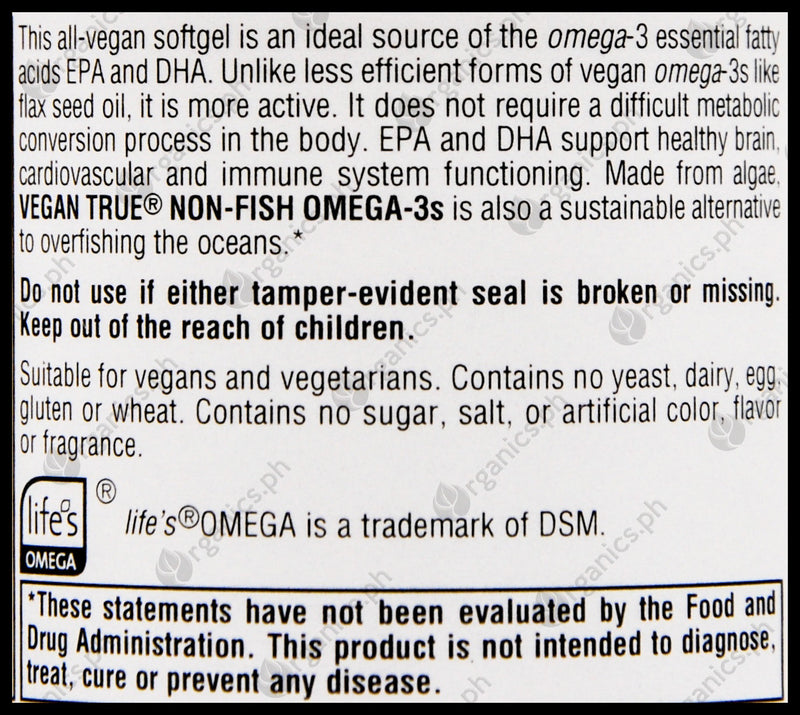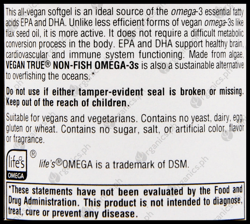 • Made from algae, VEGAN TRUE® NON-FISH OMEGA-3s is also a sustainable alternative to overfishing the oceans.