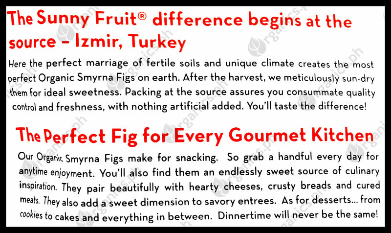 • The Sunny Fruit difference begins at the source. A marriage of the fertile soils and unique climate of Izmir, Turkey creates the most perfect, nutrient-rich, organic, and vegan, Turkish Dried Figs on earth.