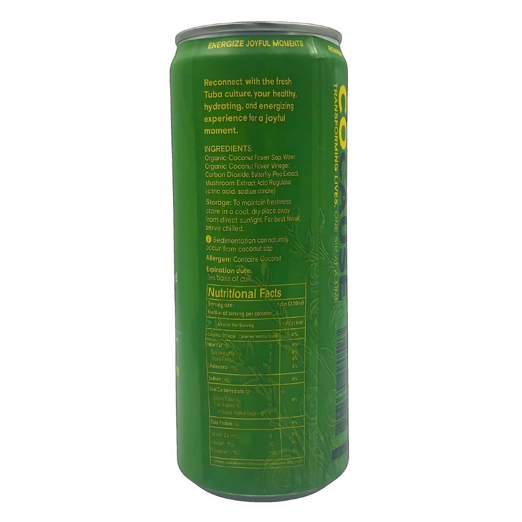 Organic Coconut Flower Sap, Water, Organic Coconut Flower Vinegar, Carbon Dioxide, Butterfly Pea Extract, Mushroom Extract, Acid Regulator (citric acid, sodium citrate)