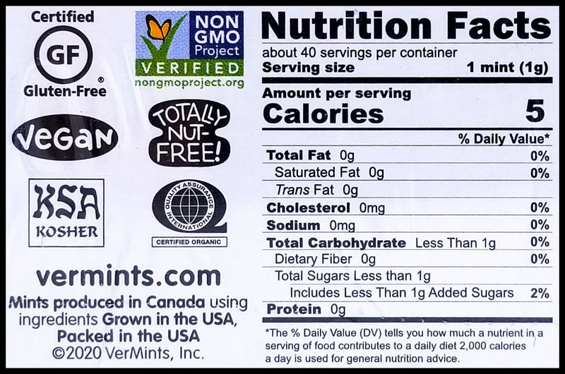 - Our name comes from the Latin word 'Ver'. It means 'true'. VerMints are True Mints. They are honest. They are clean. They are truly the very best. VerMints organic mints and pastilles are organic, gluten-free, non-GMO, nut-free, AND kosher. We ditched all the gross, health-harming, chemically-modified stuff that you usually find in mints and made super tasty mints from nature and nature only.